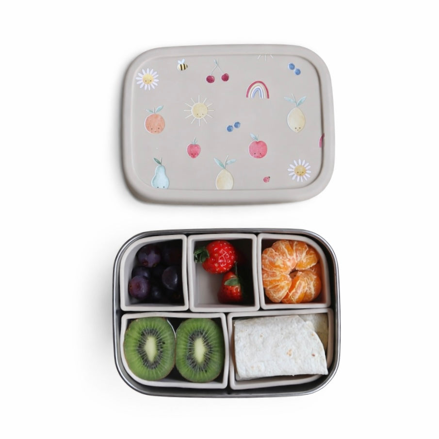 Each compartment is topped with a soft silicone lid featuring a fun print, making lunchtime exciting for little ones while helping keep food secure and fresh.